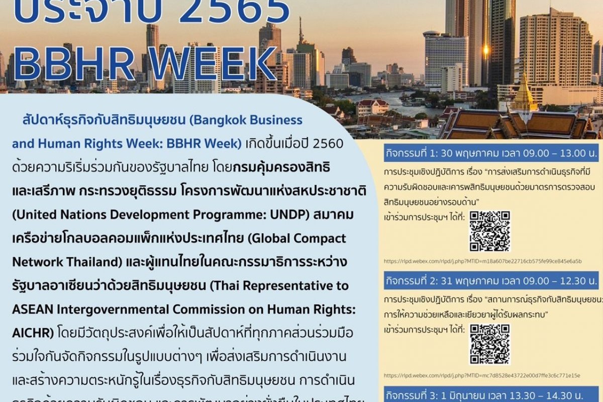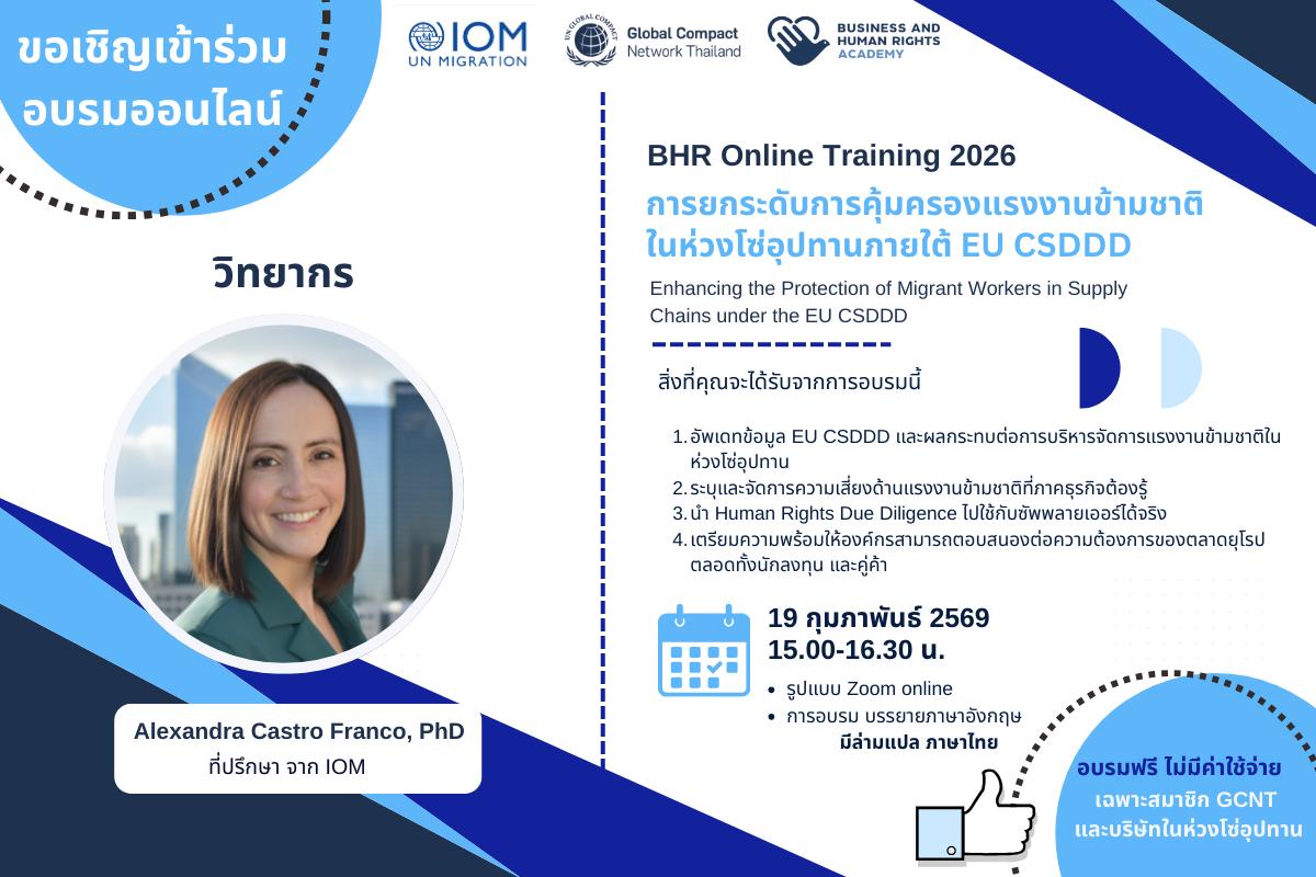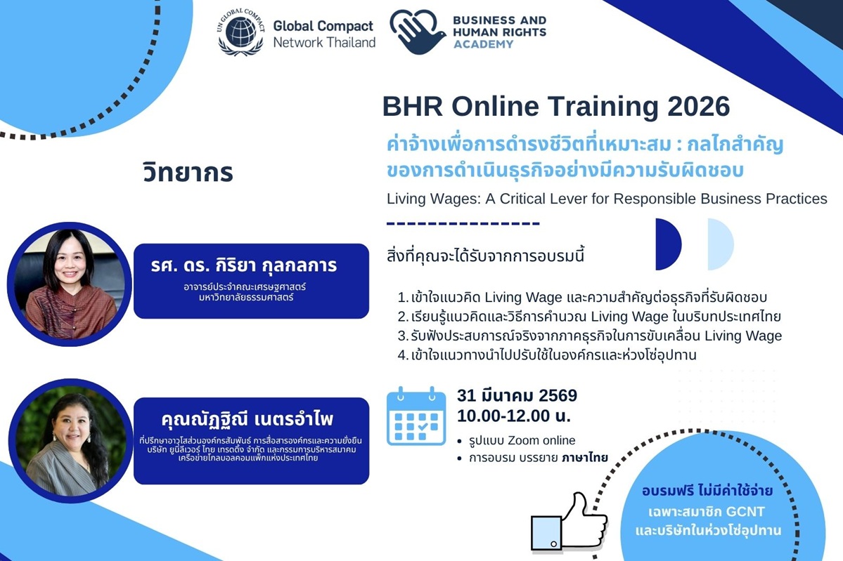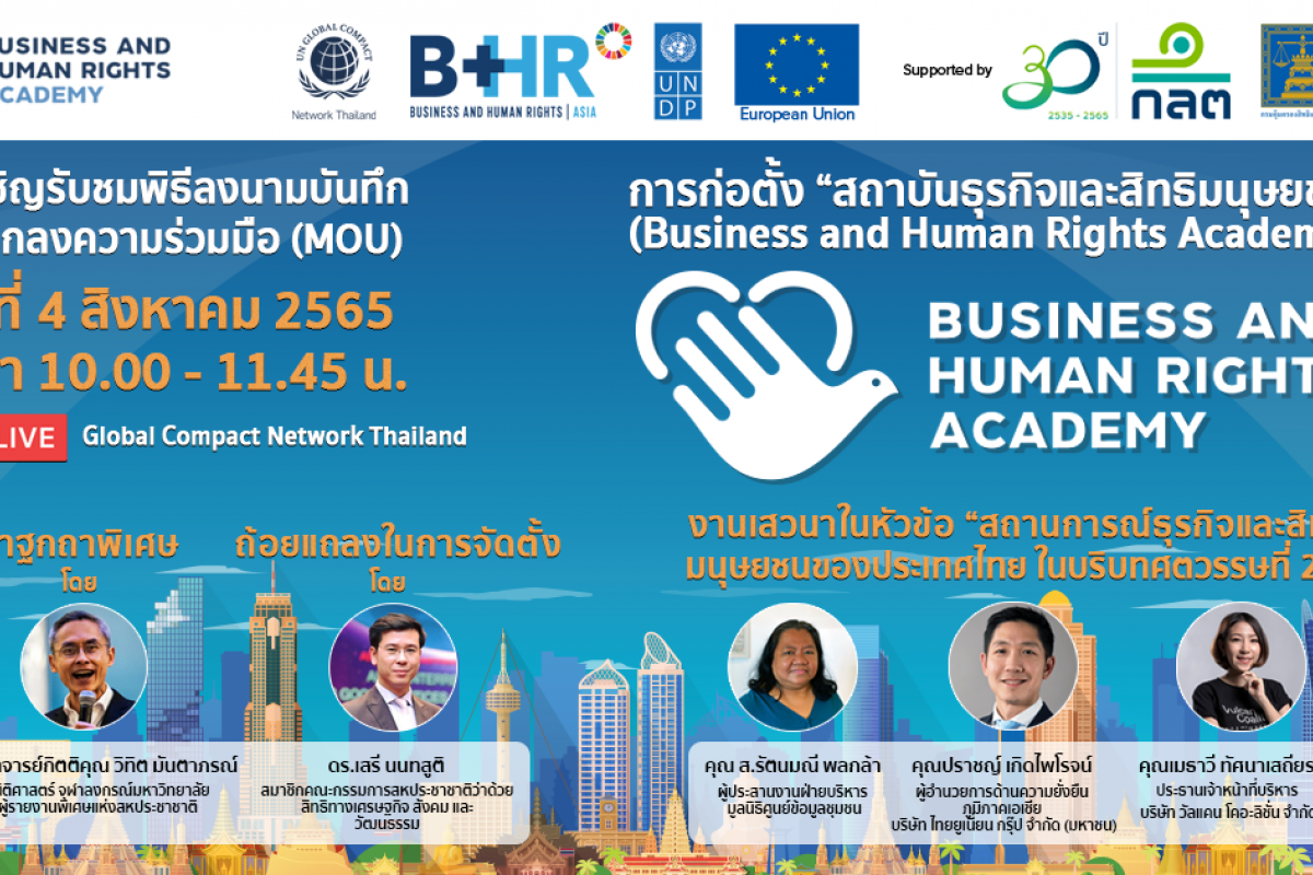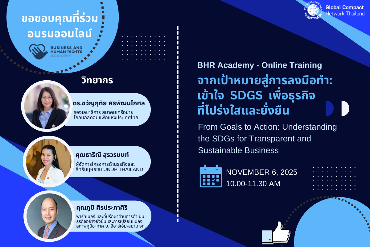 ผู้ประกอบการภาคธุรกิจไม่เพียงแต่จะมีหน้าที่ในการประกอบธุรกิจของตนเพื่อสร้างผลกำไรและรายได้ ตลอดจนส่งมอมสินค้าหรือบริการที่ตอบสนองต่อความต้องการของลูกค้าและสังคมแล้วนั้น ยังจำเป็นที่จะต้องดำเนินธุรกิจของตนอย่างมีความรับผิดชอบต่อสังคมและ สิ่งแวดล้อมในฐานะหน่วยงานหนึ่งของระบบเศรษฐกิจ กล่าวคือ ต้องมีการป้องกันไม่ให้การดำเนินธุรกิจของตนและกิจกรรมต่างๆ ที่เกี่ยวข้องสร้างผลกระทบเชิงลบต่อบุคคลใดก็ตาม และเพื่อเป็นการส่งเสริมให้องค์กรภาคธุรกิจในไทยดำเนินธุรกิจอย่างสอดคล้องกับหลักสิทธิ มนุษยชนและเป้าหมายการพัฒนาที่ยั่งยืนของสหประชาชาติ (UN SDGs) ทั้ง 17 ประการ สมาคมเครือข่ายโกลบอลคอมแพ็กแห่งประเทศไทย ร่วมกับหน่วยงานพันธมิตรจากหลากหลายภาคส่วน ได้แก่ กรมคุ้มครองสิทธิและเสรีภาพ กระทรวงยุติธรรม สำนักงานคณะกรรมการสิทธิ มนุษยชนแห่งชาติ สำนักงานคณะกรรมการกำกับหลักทรัพย์และตลาดหลักทรัพย์ และสำนักงานโครงการพัฒนาแห่งสหประชาชาติประจำประเทศไทย (United Nations Development Programme – UNDP) จัดตั้ง “สถาบันธุรกิจกับสิทธิมนุษยชน (BHR Academy: Business and Human Rights Academy)” เพื่อเสริมสร้างความรู้และความเข้าใจในประเด็นด้านสิทธิมนุษยชนสำหรับองค์กรภาคธุรกิจ ตลอดจนพัฒนาศักยภาพในการนำหลักการและแนวปฏิบัติด้านสิทธิมนุษยชนที่ดีไปใช้ให้เกิดผลได้จริง โดยคาดหวังว่าจะผลักดันให้เป็นศูนย์กลางการอบรมสำหรับภูมิภาคเอเชีย-แปซิฟิก